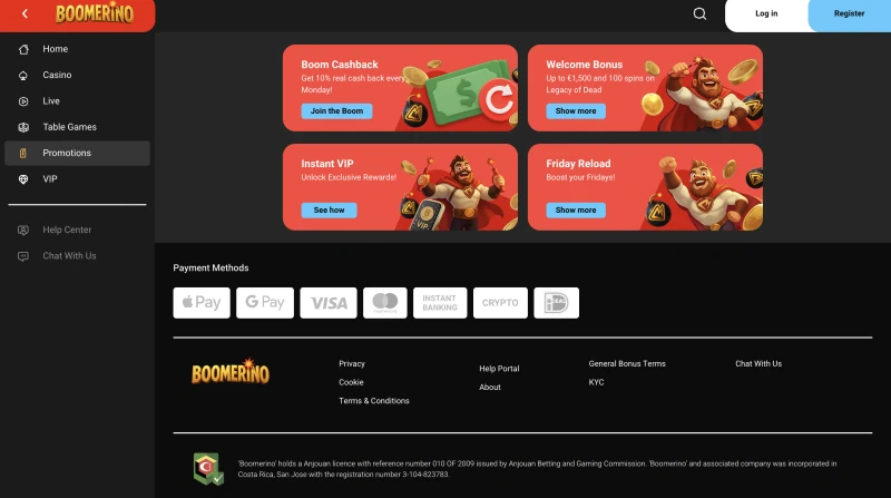 We draaien doorlopende promo’s voor regelmatig spelen, en we houden het schema stabiel zodat je je week makkelijk kunt plannen. De meest besproken aanbieding is onze woensdag free spins-drop, een promotie in de stijl van een Boomerino casino bonus zonder storting omdat er geen storting voor nodig is. Je vindt ook een vrijdag reload-campagne om weekendplay te ondersteunen, plus wekelijkse VIP-cashback die kan oplopen tot 20% voor VIP-leden. Wanneer er toernooien beschikbaar zijn, vermelden we die in het gedeelte Promoties met starttijd, regels en prijsdetails.