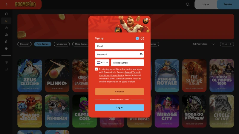 Een account aanmaken is ontworpen om snel te gaan, en je kunt belangrijke voorwaarden bekijken voordat je stort. Als je terugkeert, staat de knop Boomerino inloggen altijd zichtbaar bovenaan de pagina op desktop en mobiel. Voor spelers uit Nederland raden we aan om vroeg te verifiëren, omdat uitbetalingen kunnen worden vastgehouden totdat de controles zijn afgerond.